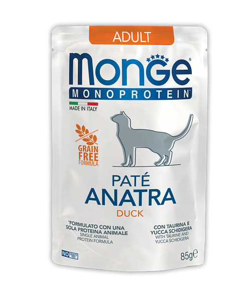 Monge Monoprotein Anatra - паучи для взрослых кошек утка - это полноценный сбалансированный рацион из мяса утки для взрослых кошек с особыми потребностями. В состав паштета входят один источник белка животного происхождения и один источник углеводов, такой как картофель.
