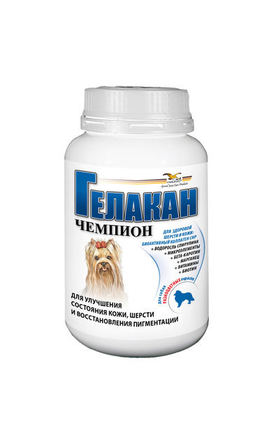 Гелакан Чемпион - сбалансированный комплекс для укрепления опорно-двигательного аппарата, улучшения состояния шерсти, когтей, восстановления пигментации кожи и слизистых оболочек. Содержит коллагеновый гидролизат CHP, кальций, лецитин, цинк, морские водоросли Spirulina Algae, витамин Е, B12, B5, B6, магний, железо, медь, натрий, биотин, фолиевую кислоту, бета-каротин. Прекрасно подходит для поддержания собак в безупречной выставочной кондиции.