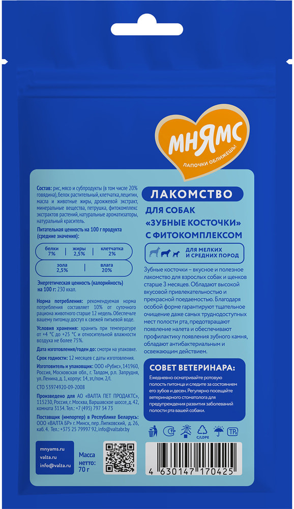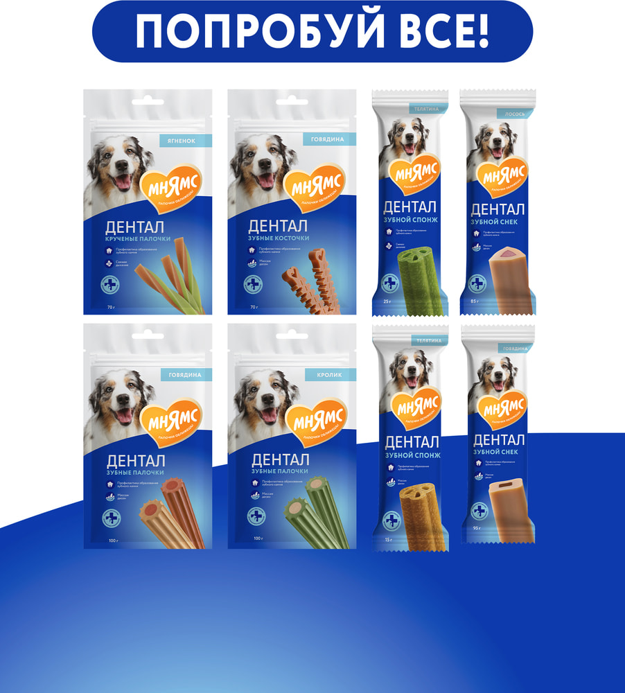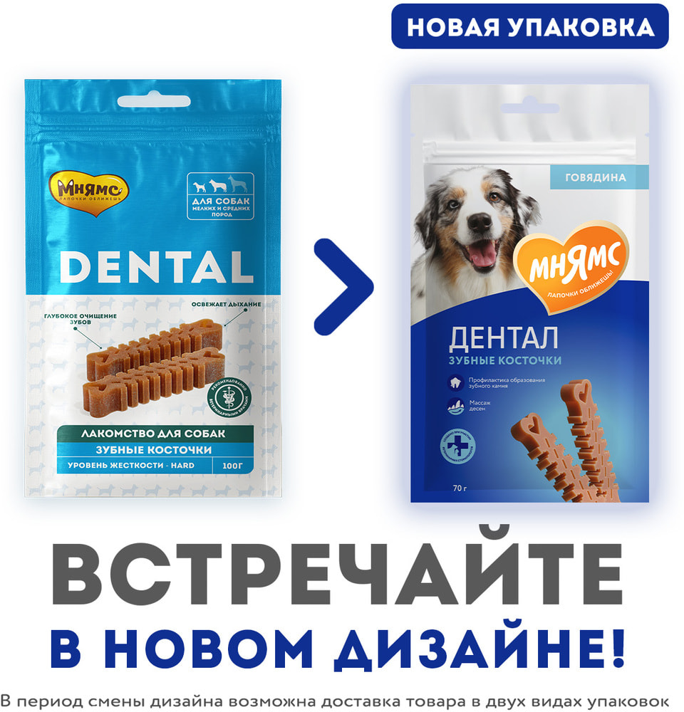 Мнямс DENTAL "Зубные косточки" – вкусное и полезное лакомство для взрослых собак и щенков старше 3-х месяцев. Обладают высокой вкусовой привлекательностью и прекрасной поедаемостью. Благодаря особой форме гарантируют тщательное очищение даже самых труднодоступных мест полости рта, предотвращают появление налета и обеспечивают профилактику появления зубного камня, обладают антибактериальным и освежающим действием.