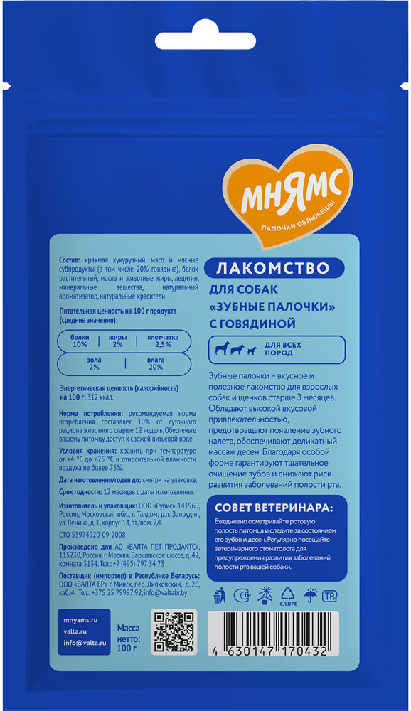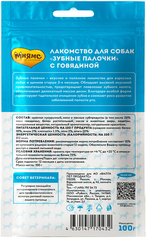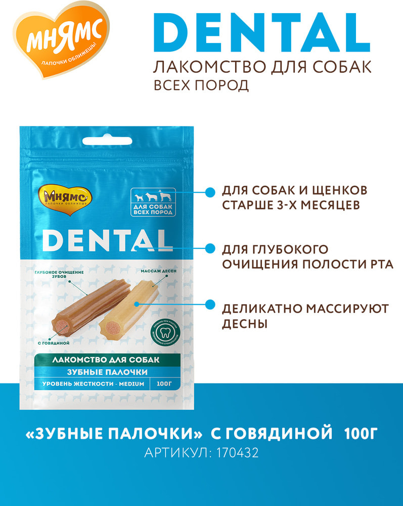 Мнямс DENTAL "Зубные палочки" с говядиной – вкусное и полезное лакомство для взрослых собак и щенков старше 3-х месяцев. Обладают высокой вкусовой привлекательностью, предотвращают появление зубного налета, обеспечивают деликатный массаж десен. Благодаря особой форме гарантируют тщательное очищение зубов и снижают риск развития заболеваний полости рта.