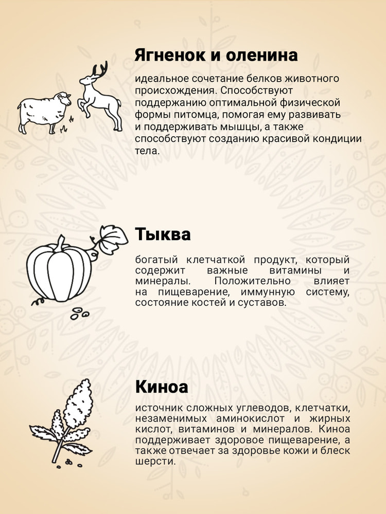 Основные источники белка в корме — свежее мясо ягненка и оленя. Комбинация этих белков легко переваривается, помогает поддерживать оптимальный вес питомца, стабилизирует обмен веществ. Ягненок и оленина — отличные источники незаменимых аминокислот, витаминов и минералов.