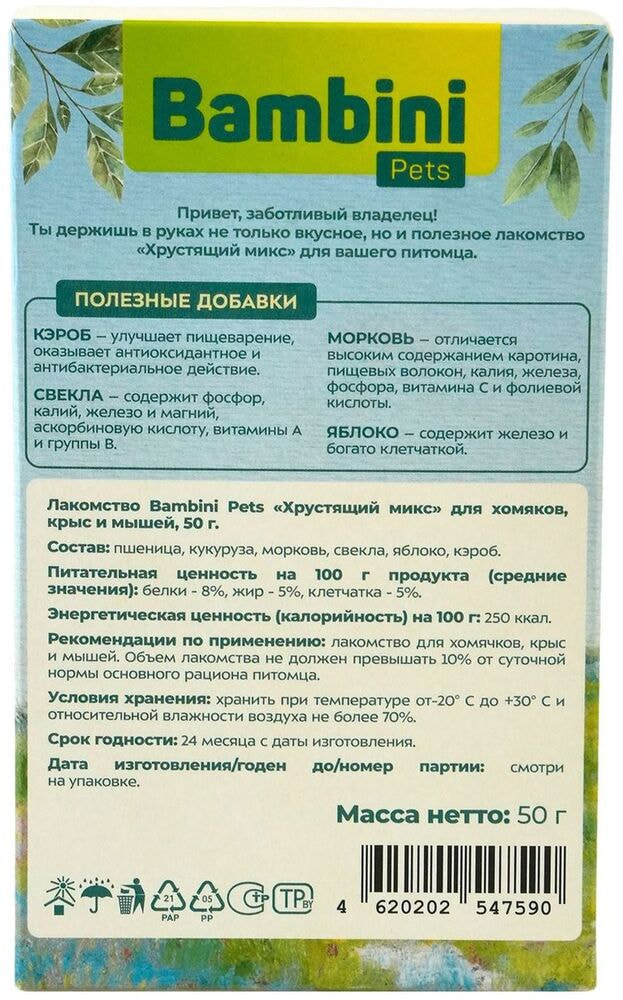 Хрустящий микс - Это не только вкусное, но и полезное лакомство для крыс, мышей и хомячков. В оснвое лакомтсва используются кукуруза и пшеница, что помогает сохранить видоспецифичный подход в питании малышей. Морковь, свекла, яблоко и кэроб, входящие в состав богаты витаминами и макроэлементами. Кэроб улучшает пищеварение, лечит желудочно-кишечные расстройства, оказывает антиоксидантное и антибактериальное действие.Морковь отличается высоким содержанием каротина, пищевых волокон, калия, железа, фосфора, витамина С и фолиевой кислоты. Свекла содержит в себе фосфор, калий, железо и магний,аскорбиновую кислоту, витамины А и группы В. Яблоко содержит железо и богато клетчаткой. Bambini Pets делаем жизнь малышей лучше и радостнее!