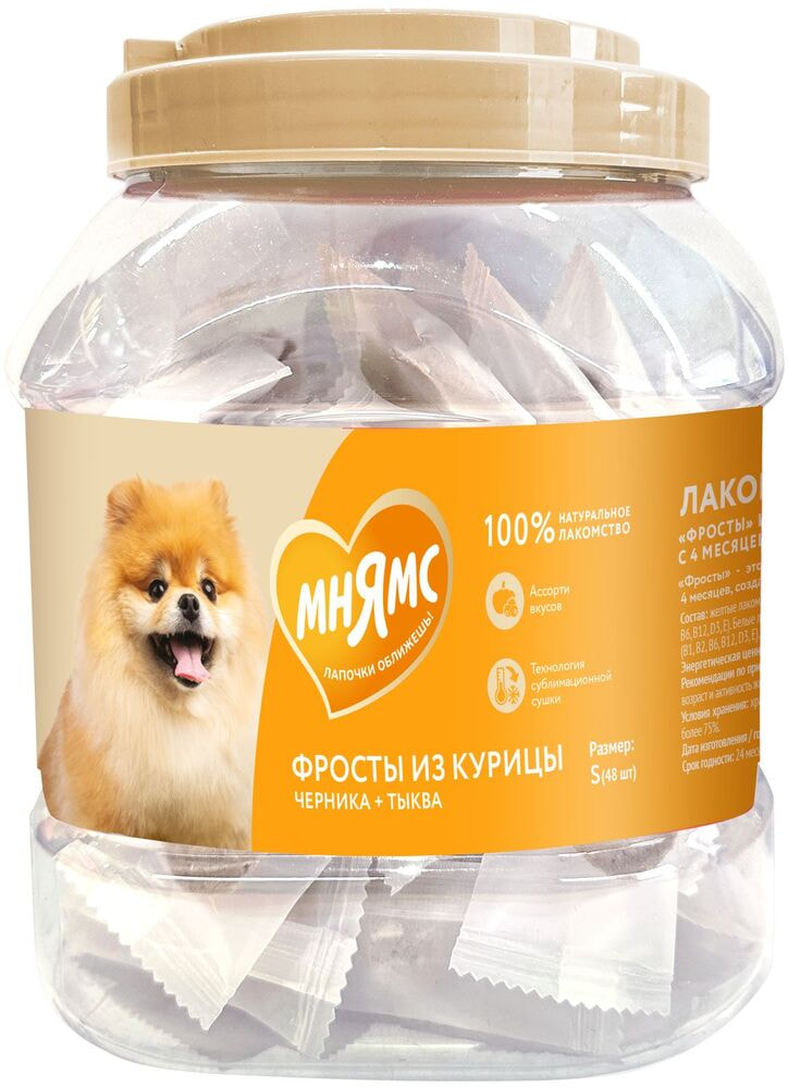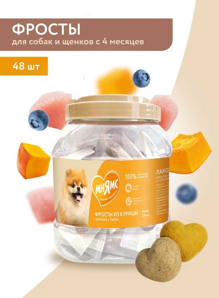 "Мнямс" Лакомство "Фросты" из курицы для собак и щенков с 4 месяцев - это сублимированные беззерновые лакомства с высоким содержанием животного белка (куриная грудка 73%), созданные при помощи прогрессивной технологии сушки, которая сохраняет натуральный вкус мяса и питательные свойства ингредиентов. Черника и тыква в составе богаты витаминами и антиоксидантами, которые улучшают обмент веществ. Одна упаковка "Фростов" содержит лакомства двух видов: из курицы с черникой и из курицы с тыквой, которые подходят для питомцев всех пород. Для собак разного веса предусмотрены различные нормы потребления: от 1 фроста в день для собак весом <5кг до >5 фростов в день для собак весом более 25 кг. Размер S, в упаковке 48 штук. Лакомство "Фросты" из курицы для собак и щенков с 4 месяцев очень вкусное и не оставит равнодушным даже самого привередливого любимца!