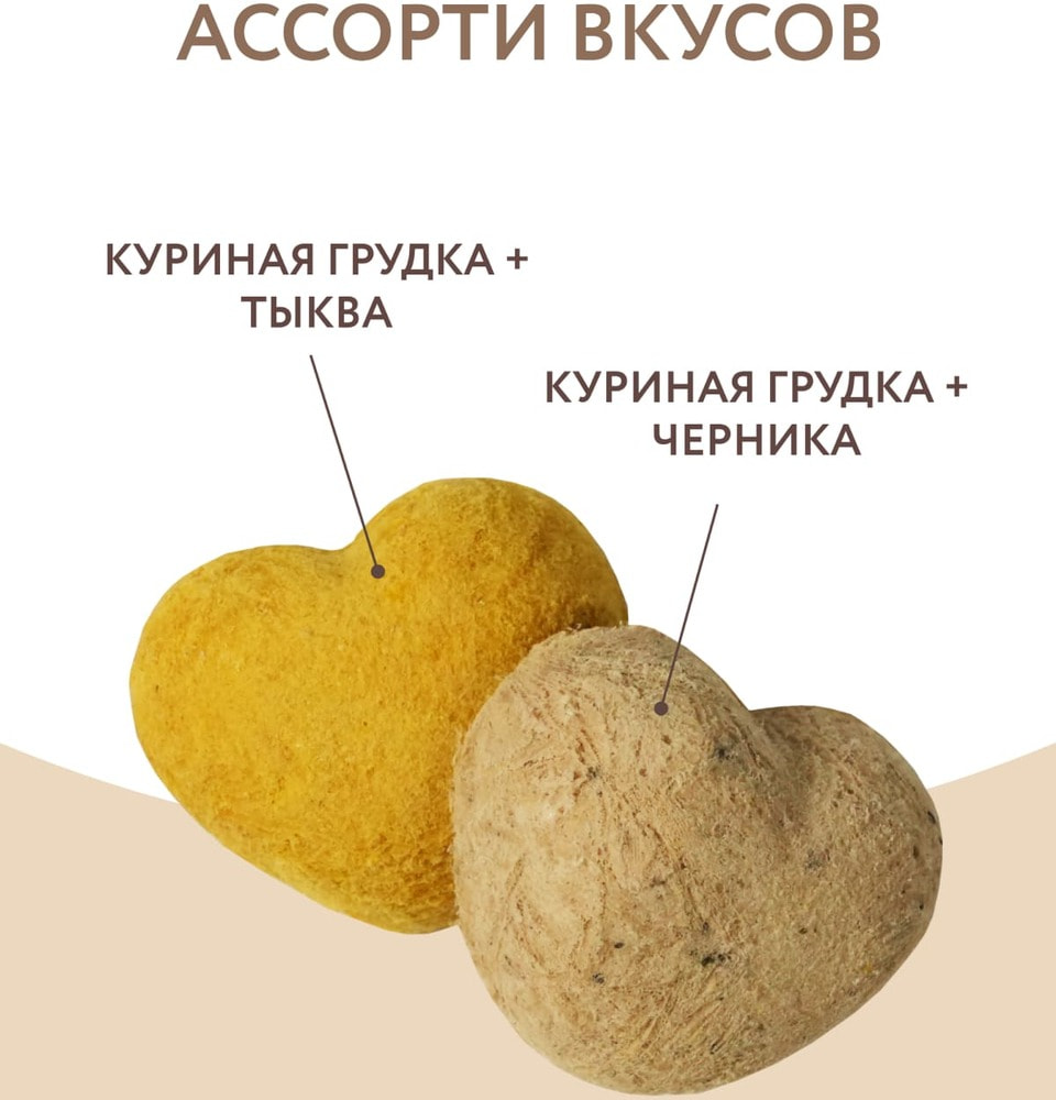 Желтые лакомства: куриная грудка 73%, сухое козье молоко 20%, тыква 5%, витамины (В1,В2,В6, В12,D3, Е). Белые лакомства: куриная грудка 73%, сухое козье молоко 20%, черника 5%, витамины (В1,В2,В6, В12,D3, Е).Характеристики