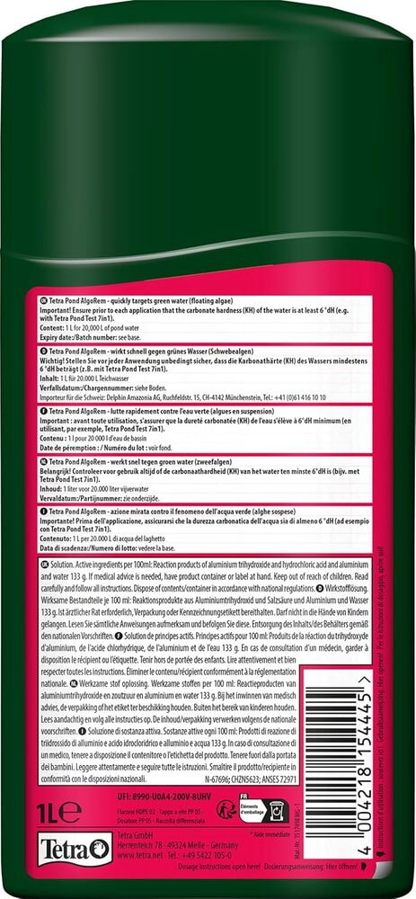 Специальный состав TetraPond AlgoRem позволяет собирать планктонные водоросли в комки, способствуя их быстрому удалению из водоема, и очищать воду, не оказывая отрицательного влияния на природный биологический баланс водоема. Удаляя из воды фосфаты, препарат предотвращает рост водорослей. TetraPond AlgoRem не содержит ядовитых веществ, свободен от альгицидов и гербицидов, сохраняет свое действие в течение нескольких часов, прост в использовании благодаря мерному колпачку.