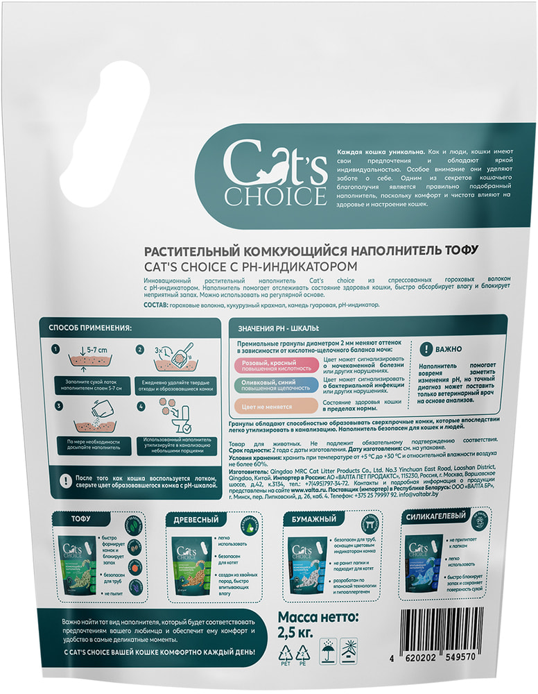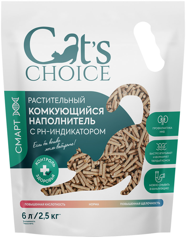 Инновационный растительный наполнитель Cat's choice из спресованных гороховых волокон с pH-индикатором.