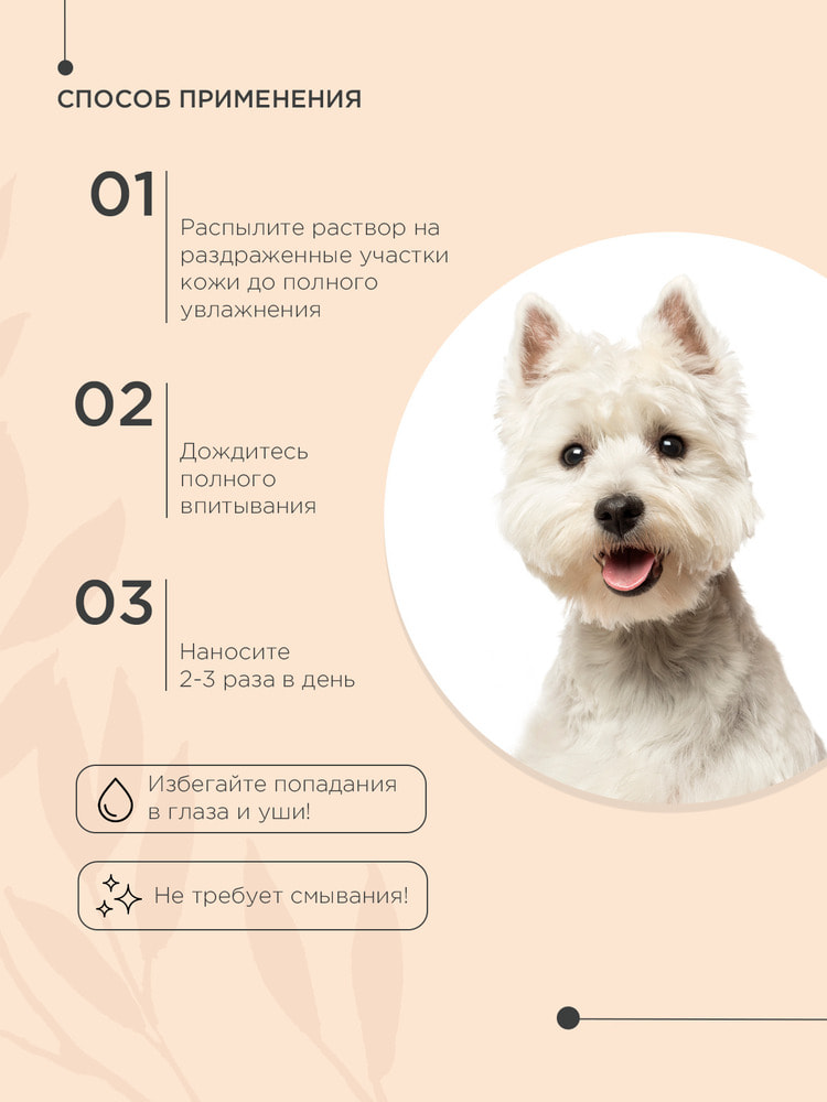 Благодаря технологии наноэмульсии активные компоненты спрея быстро проникают в кожно-шерстный покров животного, оказывая желаемый эффект.
