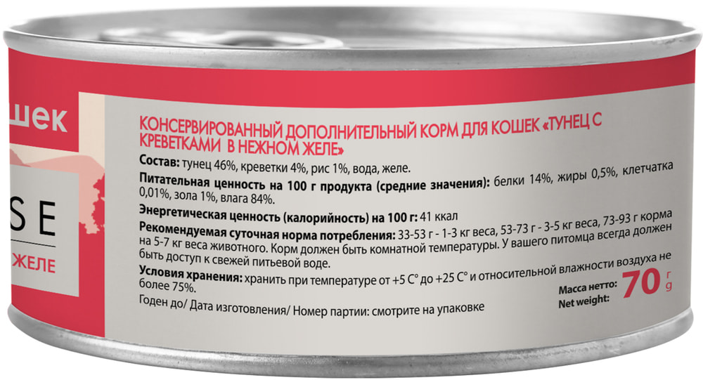 тунец 46%, креветки 4%, рис 1%, вода, желе.